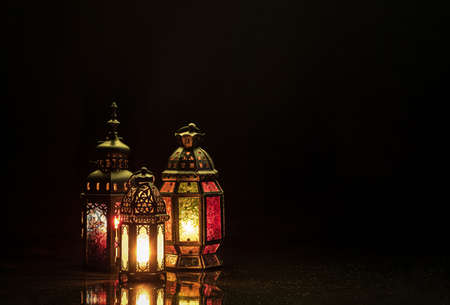 Candle light lids on muslim style's lantern shining on dark background, use as greeting on ramadan kareem mubarak