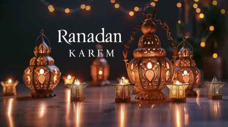 A Ramadan card surrounded by glowing lanterns, golden stars, and elegant decorations, creating a warm and festive ambiance