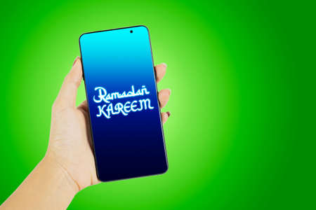 Close up of young woman hand showing ramadan kareem text on the cellphone with green screen background