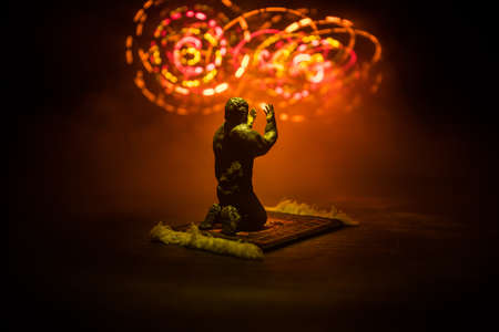 Silhouette of mosque building on toned foggy background. Ramadan Kareem background. Realistic mosque miniature with prayer silhouette. Selective focus