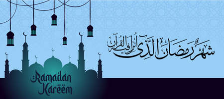 Ramadan background with mosque silhouettes , lantern, quran calligraphy is good for banner, backdrop, web etc