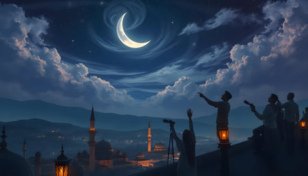 Silhouetted figures gaze at a crescent moon above a city at night. A tranquil scene evokes wonder and serenity.