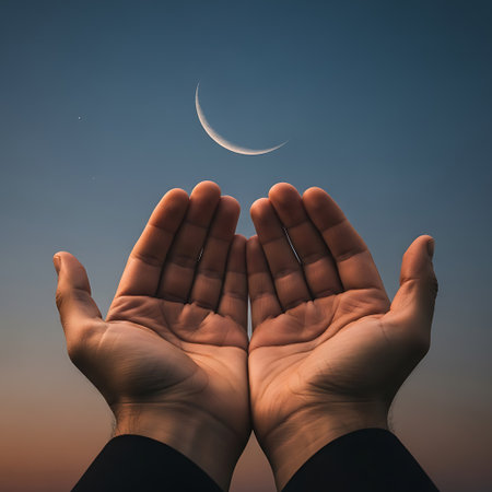 Muslim hands raised in prayer against the backdrop of a dark sky adorned with twinkling stars and a crescent moon, symbolizing the divine connection and reverence felt during moments of worship