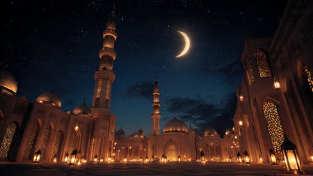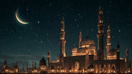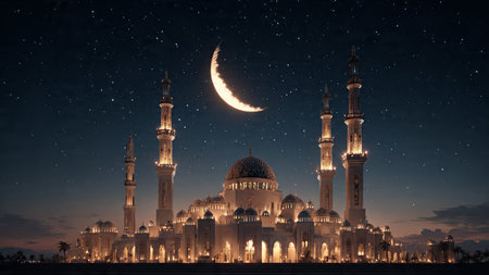 Majestic mosque silhouette against twilight sky with crescent moon and stars, symbolizing Ramadan's holy nights and Islamic faith