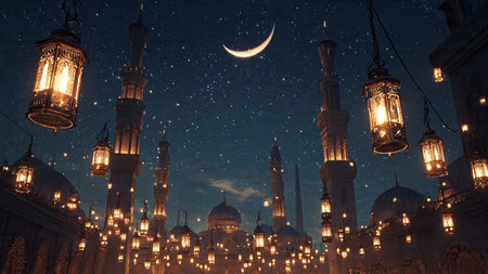 A crescent moon and stars illuminate Islamic city skyline at dusk, creating serene and enchanting atmosphere. silhouette of mosques and minarets adds to beauty of scene