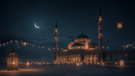 Generative AI Image of Islamic Lanterns Hanging in Mosque Yard with Crescent Moon at Night