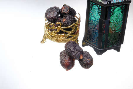 Beautiful background with a shining lantern and dried dates isolated on white.The Muslim feast of the holy month of Ramadan Kareem.
