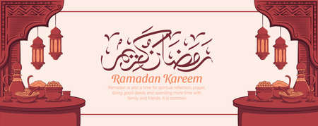 Ramadan kareem banner with hand drawn islamic illustration ornament on white background. Vector Illustration