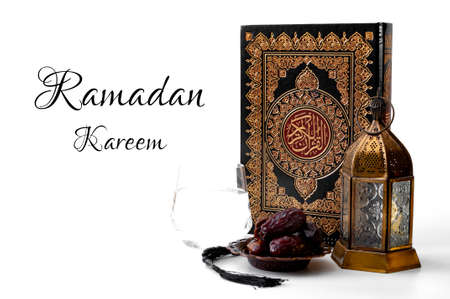 Ramadan kereem with holy quran, dates and rosary isolated on white background