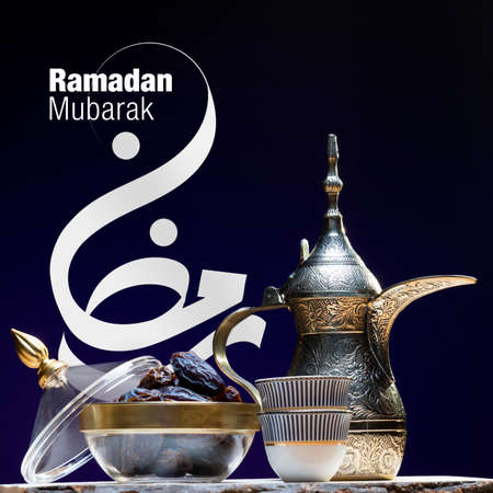 Ramadan Kareem greeting card with arabic tea pot, dates and dates