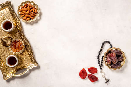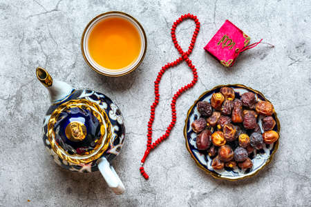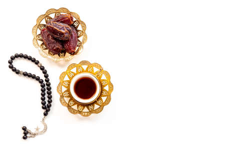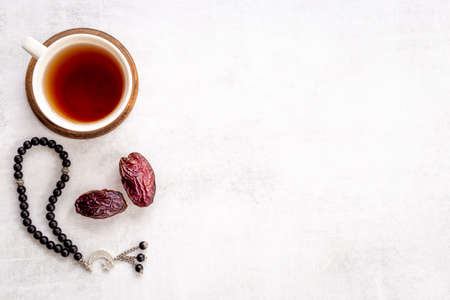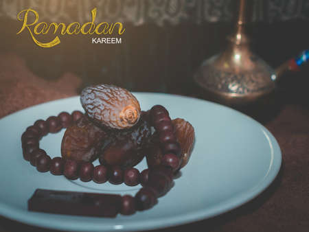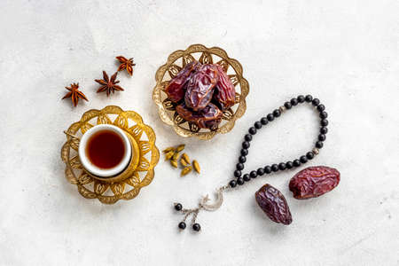 Ramadan Kareem background. Islamic rosary and dates fruits with tea