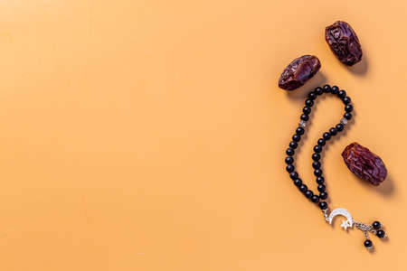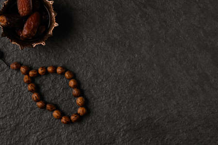 Ramadan concept. Black Islamic rosary with crescent with dates fruits