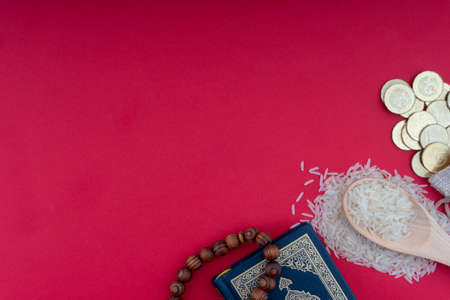 Holy Quran, Coins,Rosary and rice. Zakat concept. Zakat is a form of alm-giving as a religious obligation