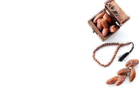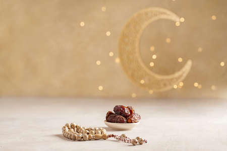 Ramadan Kareem concept. Islamic rosary with star and crescent and dates fruits