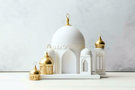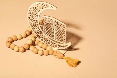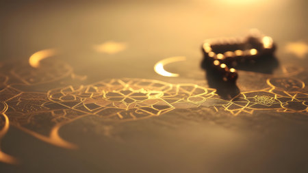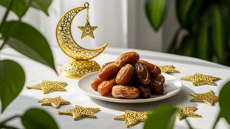 Golden Ramadan moon decor with Islamic rosary beads and dates fruit.