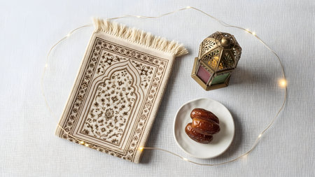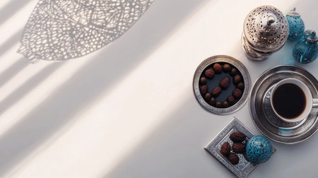 A flat lay composition featuring Islamic prayer beads, dates, and coffee on top of silver plates with Arabic patterns. The background is white with soft shadows. There's space for text or product placement in the bottom right corner. A cozy atmosphere is created by using warm colors such as blue and brown. This scene symbolizes Ramadan celebration and culture, showcasing traditional elements like lanterns and squares of magnolia lights decoration. --chaos 30 --ar 16:9 --v 6.1 Job ID: 188f9037-82fa-4a45-b821-2c3d3203cf74