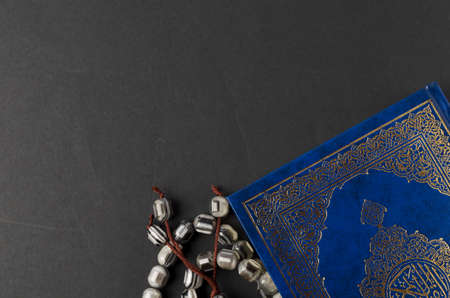 Islamic concept for eid and ramadan: The holy qoran with tasbih (rosary beads) and dates