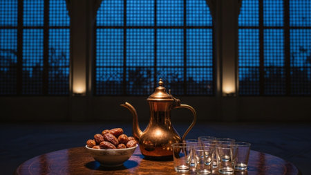 An ornate lantern and a bowl of dates on a patterned rug, bathed in warm light, symbolize cultural traditions and peaceful contemplation