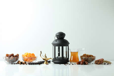 Lantern and dates fruit on marble with white orchid flower for the Muslim feast of the holy month of Ramadan Kareem.