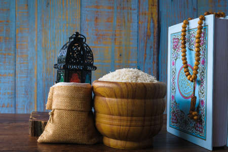 Rice, Quran Kareem , wooden rosary , and dates. Zakat is the sharing of wealth from the rich for the less fortunate. Arabic word translation : The Holy Al Quran (holy book of Muslim)