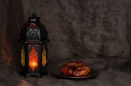 Black lantern and dates fruit on dark cloth background for the Muslim feast of the holy month of Ramadan Kareem.