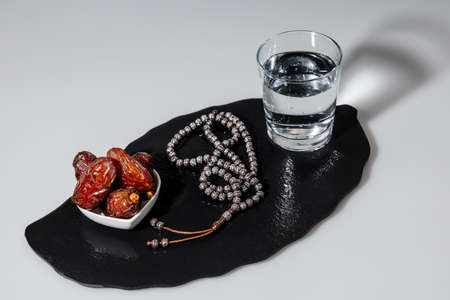 Muslim rosary with dried dates and a glass of spring water on a white background.