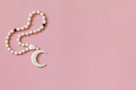 Ramadan Kareem greeting card, invitation. Ramadan Islamic rosary beads on a light pink background. Top view flat lay. copyspace.