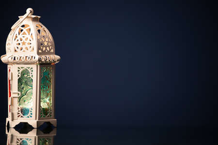 Ornamental Arabic lantern on blue background with copy space. Festive greeting card for Muslim holy month Ramadan Kareem.
