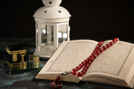 The holy quran, prayer beads, golden ramadhan lamp with islamic rosary beads on dark background ramadhan. Islamic concept