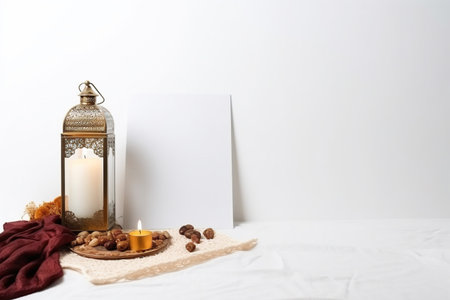 Ramadan Kareem greeting card, invitation mockup scene. Bronze plate with dates fruit, cup of tea, olive branches and glowing Moroccan lantern on linen table cloth. Iftar dinner. Eid ul Adha background