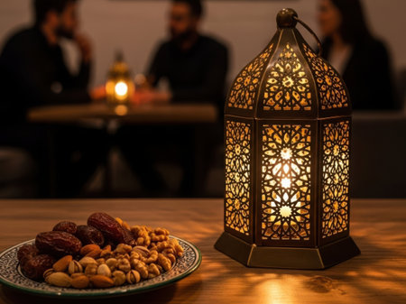A beautifully designed lantern with intricate patterns casts a warm glow on a wooden table. Beside it, a plate filled with dates and nuts adds to the ambiance. In the background, two people are engaged in conversation, creating a serene and intimate atmosphere.