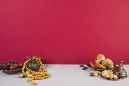 Ramadan Kareem greeting card. Table with dates fruits nuts and islamic rosary