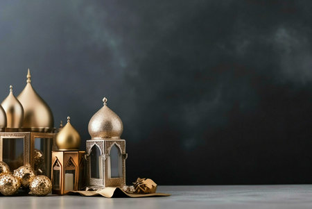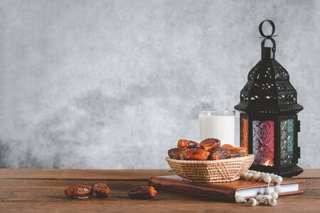 On table top image of decorations Ramadan Kareem holiday background.Close up Arabic lantern metal date and milk on brown wooden.Halal meal set for fasting is obligatory for Muslim.copy space design.