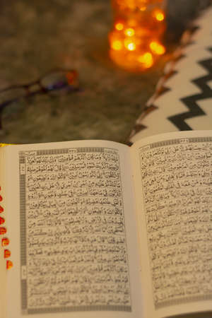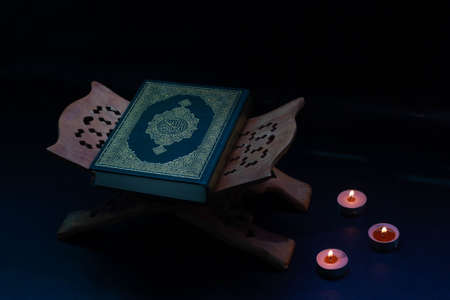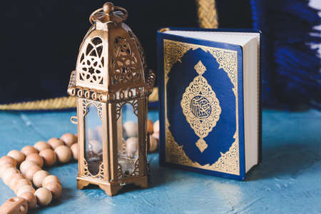 Kuran or Quran , the holy book of all Muslim shined by brighten lantern on dark blue background