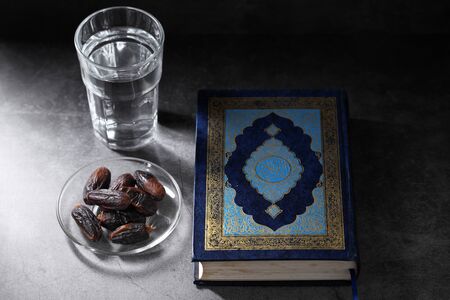 dates fruit and Islamic Book Koran on a concrete background, Islamic background in ramadan