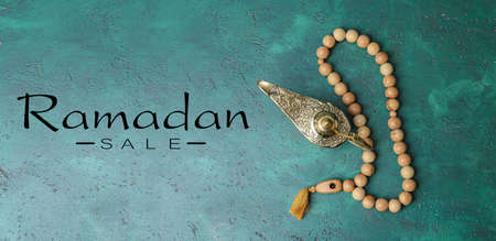 Muslim lamp, prayer beads and text RAMADAN SALE on green background, top view