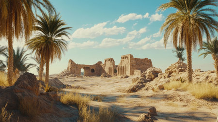 Stunning desert landscape featuring ancient ruins surrounded by palm trees, under a vibrant blue sky with scattered clouds, perfect for travel themes.
