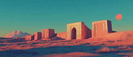 Majestic desert landscape of ancient cities in Uzbekistan during golden hour