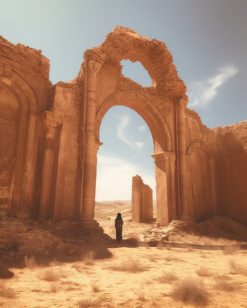 Exploring ancient ruins in scorching desert heat. Image generated with Generative AI.
