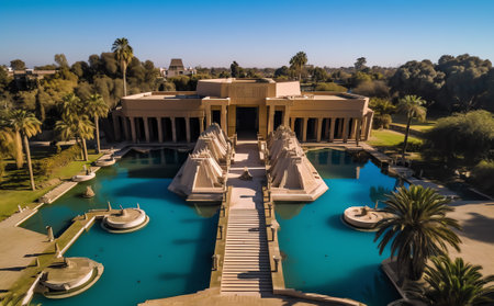 An aerial shot presents a classical building embraced by tall palm trees. The composition features symmetrical arrangement with a path leading to a pool. The scene uses natural light, with dominant shades of green and brown. Suitable for travel, architecture, and nature-related projects.