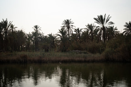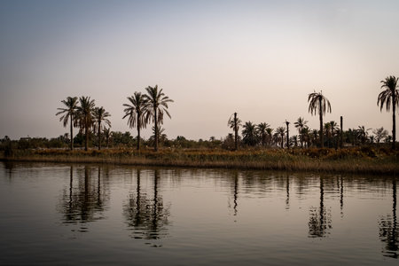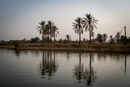 Iconic Palm Trees Line the Riverbank of the Shatt al-Arab, Their Silhouettes and Reflections Mirroring the Tranquil Water Surface at Twilight.