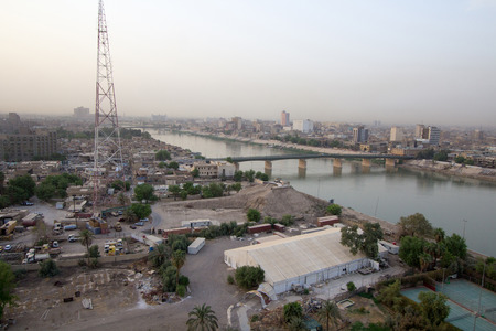 Aerial photo of the city of Baghdad, and shows where residential complexes and the Tigris River and bridges. The city of Baghdad, capital of Iraq.