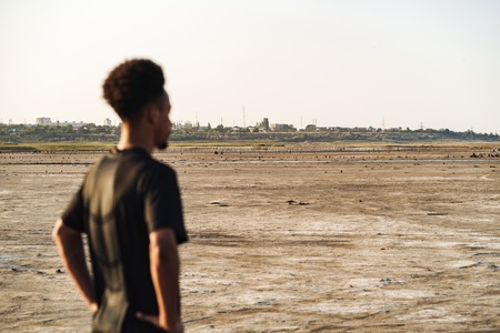 The person, downcast from the war, is haggard, his face expresses grief, his clothes are decrepit. Victim of war, genocide, war crisis conflict