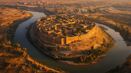 Aerial View of City With River, Aerial view of a historic Islamic city with river flowing through, AI Generated