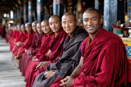 A group of monks in a Tibetan monastery, under natural light, captured with a wide-angle lens, showcasing a spiritual and tranquil way of life, ultrarealistic photo --ar 3:2 --raw --profile nk3i4wf --stylize 250 --v 7 Job ID: 29ca13c6-b662-49bb-943d-6664f23de61f