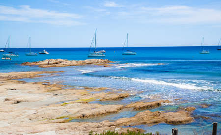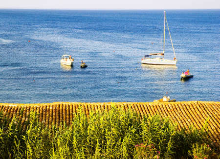 Beautiful summertime panoramic seascape. View of the cliff into the crystal clear azure sea .Ship yachts on the horizon.