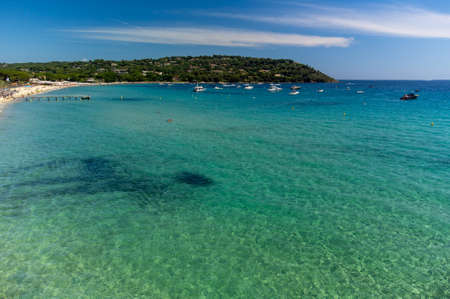 Summer holidays on French Riviera, rocks and sandy beach Escalet with crystal clear blue water near Ramatuelle and Saint-Tropez, Var, France
