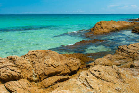 Beautiful beaches with big brown rocks and blue islands in Thailand.