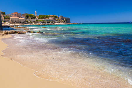 View to beautiful Algaloja old town and sandy beach with turquoise clear water, Corsica, France, Europe.