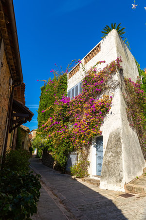 Colorful blossom of summer flowers in ancient french village Grimaud, tourists destination, Var, Provence, France